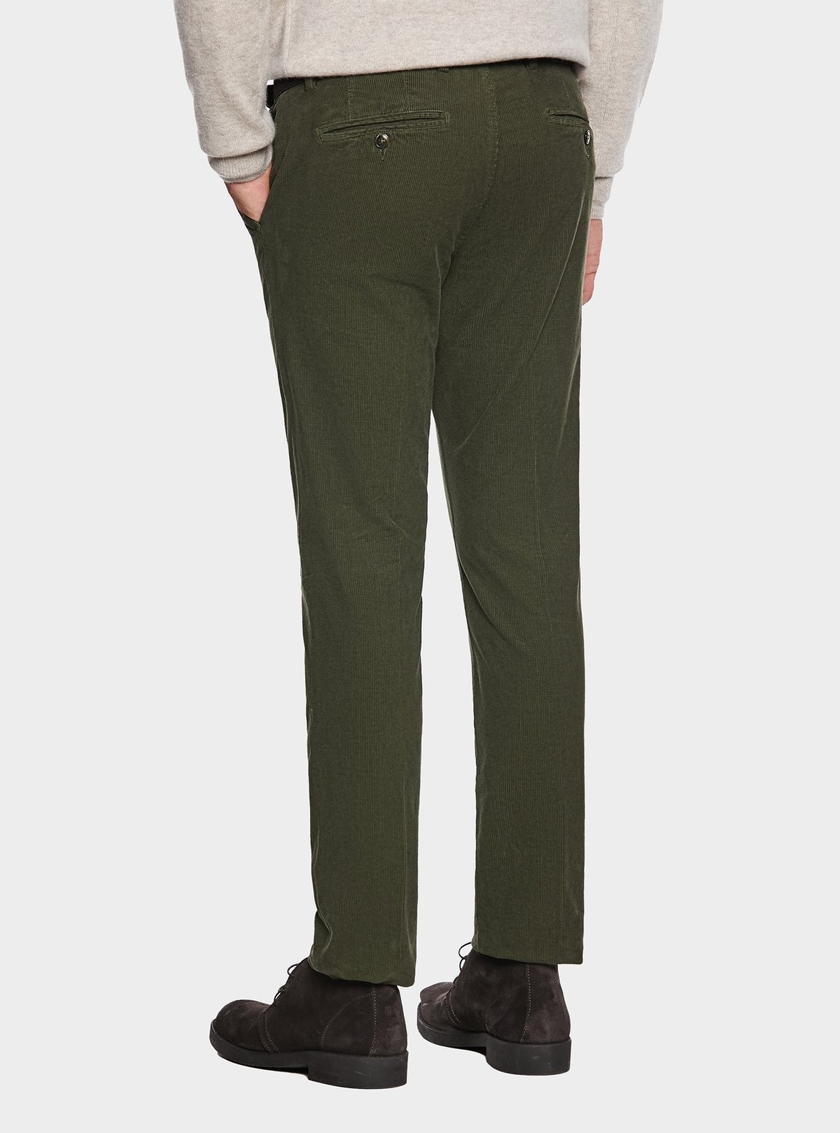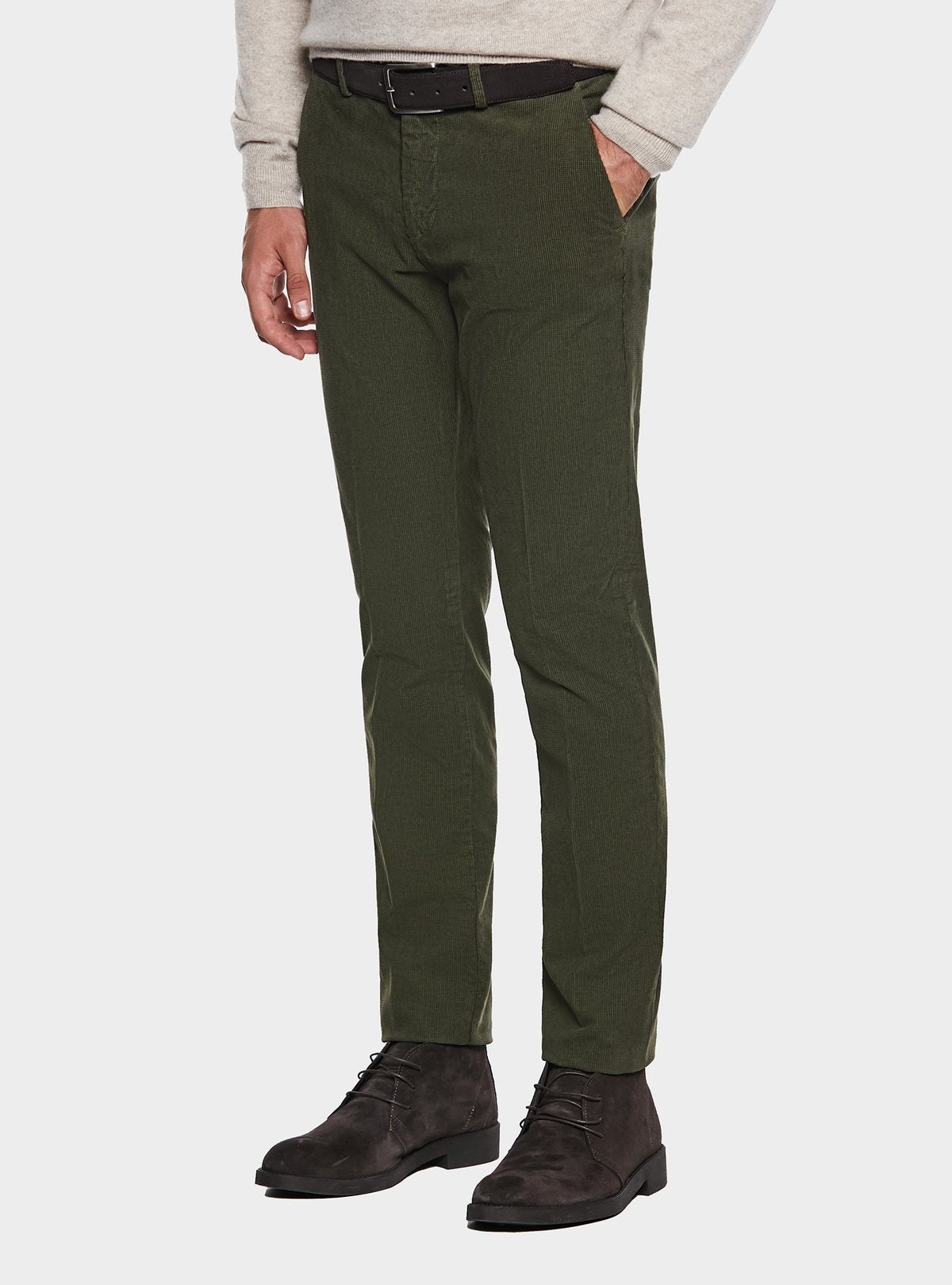 Pantalone con tasca America in velluto a coste interotte, realizzato in cotone con il 2% di spandex per garantire un maggiore comfort e una vestibilità elastica. Presenta due tasche diagonali frontali, perfette per un accesso facile e veloce, e due tasche a filetto con bottone sul retro per un tocco di praticità e stile. La chiusura è dotata di una cintura allungata, un bottone e una zip, per un fit sicuro e pratico. Il taglio regular fit assicura una silhouette comoda e contemporanea. Il modello in foto, alto 190 cm, indossa la taglia 48. Un capo versatile e alla moda, ideale per look casual e raffinati.